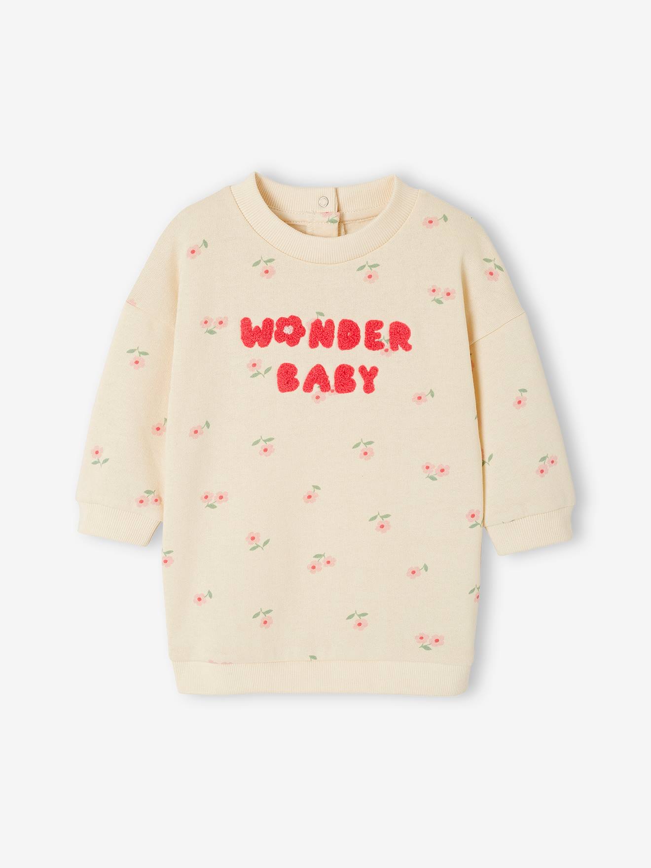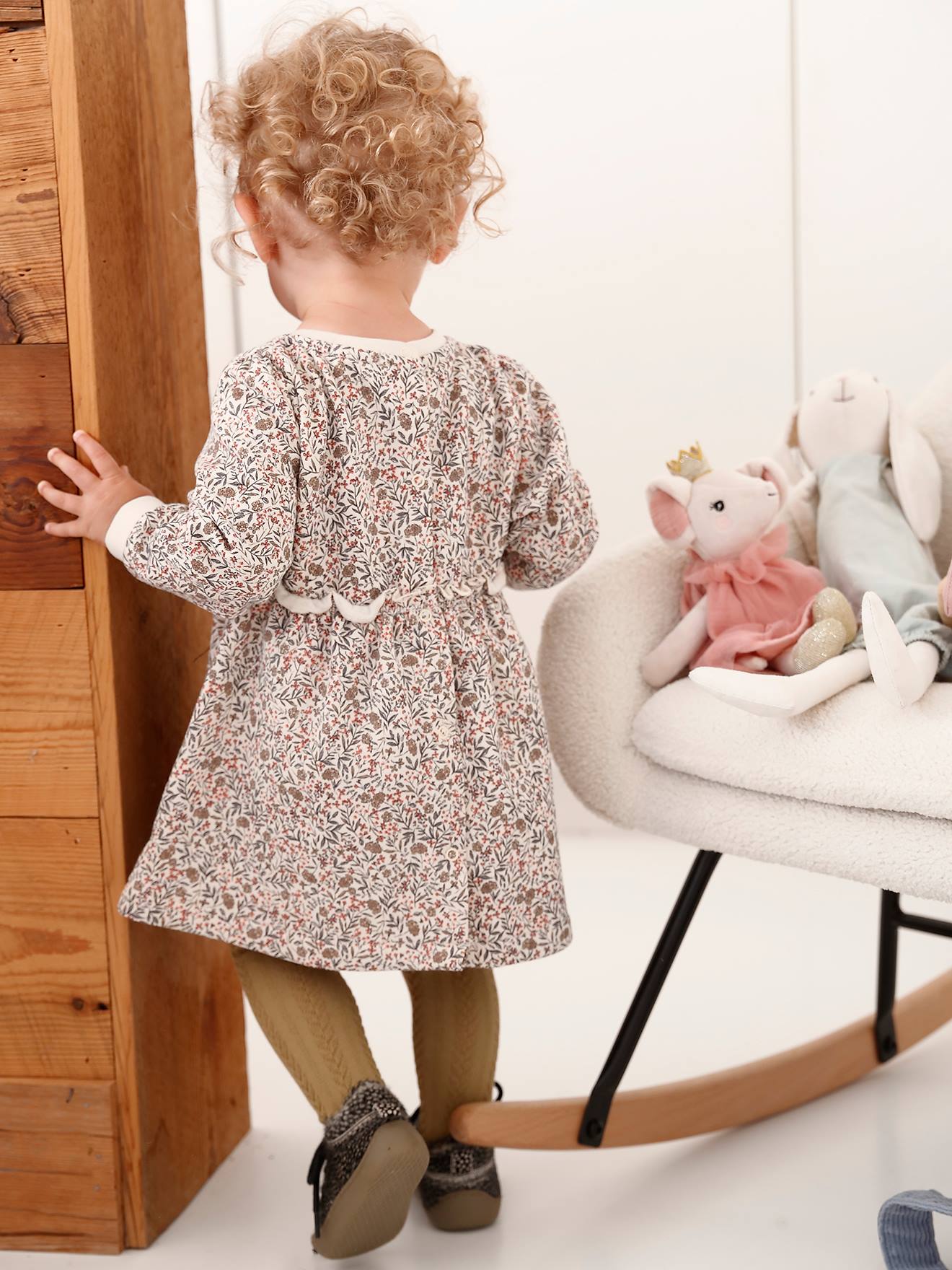 Fleece for extra comfort, broderie anglaise for a fancy touch... this dress ticks all the right boxes! Chic and practical, baby will be very stylish and super comfortable! Fleece dress for babies Ruffle in broderie anglaise Gathers below the waistband Button fastening on the front Dress for babies, ruffle in broderie anglaise, in fleece: 100% cotton.