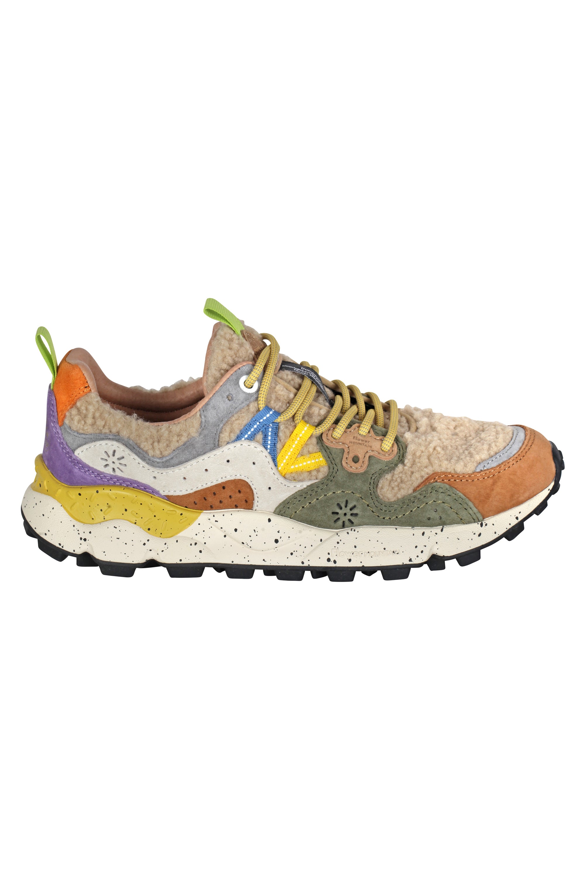 Sneakers in tessuto teddy e suede. Punta tonda. Chiusura con lacci trekking e occhielli rinforzati. Linguetta in tessuto con tirante e logo applicato. Piccoli fori e fiori laserati. Tirante in tessuto sul retro. Fodera in pelle e tessuto. Soletta in sughero naturale. Suola in gomma extralight. Altezza tacco: 3,5 cm. Composizione: pelle e tessuto. Calzata: regolare.