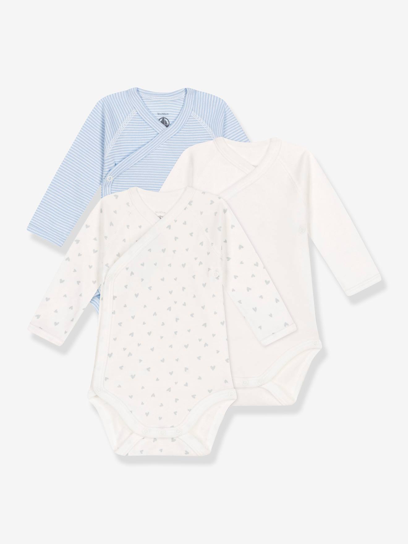 Pack of 3 long-sleeved crossover bodysuits in 1x1 rib knit, a stretchy and comfortable fabric. The cross-over bodysuit is perfect for newborns: thanks to its wide opening, you can change baby without too much fuss. Opens by press studs on the front and between legs. Long sleevesPack of 3 long-sleeved bodysuits PETIT BATEAU: 100% cotton
