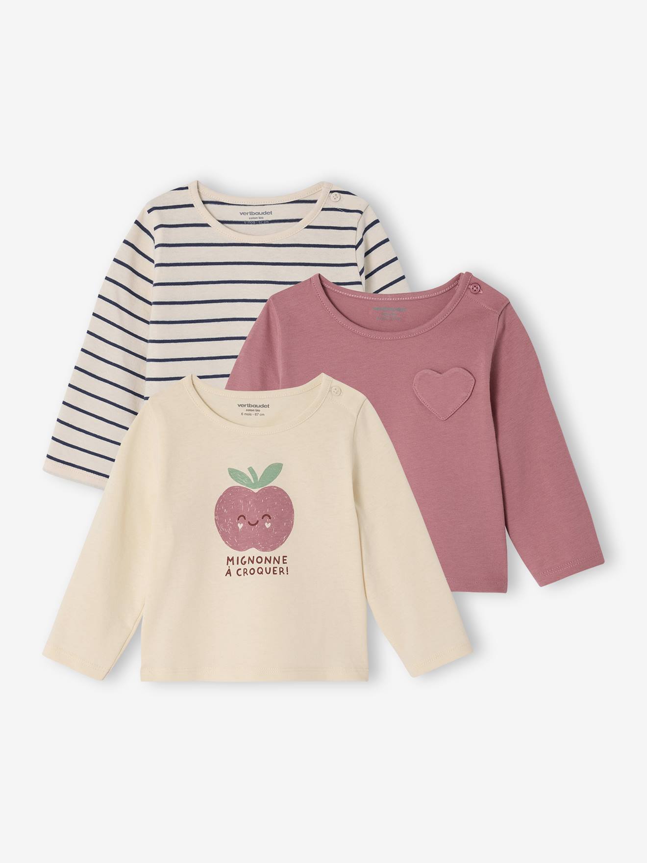 This lovely trio will add a fancy touch to baby's wardrobe! A t-shirt with an iridescent motif, one with a heart-shaped pocket, one striped... 3 different styles for adorable looks! Pack of 3 Basics baby T-shirts Round-neck Buttoned opening on the shoulder to make dressing easier Long sleeves Iridescent details on some motifs 1 T-shirt with motif on the front - different motif depending on the c