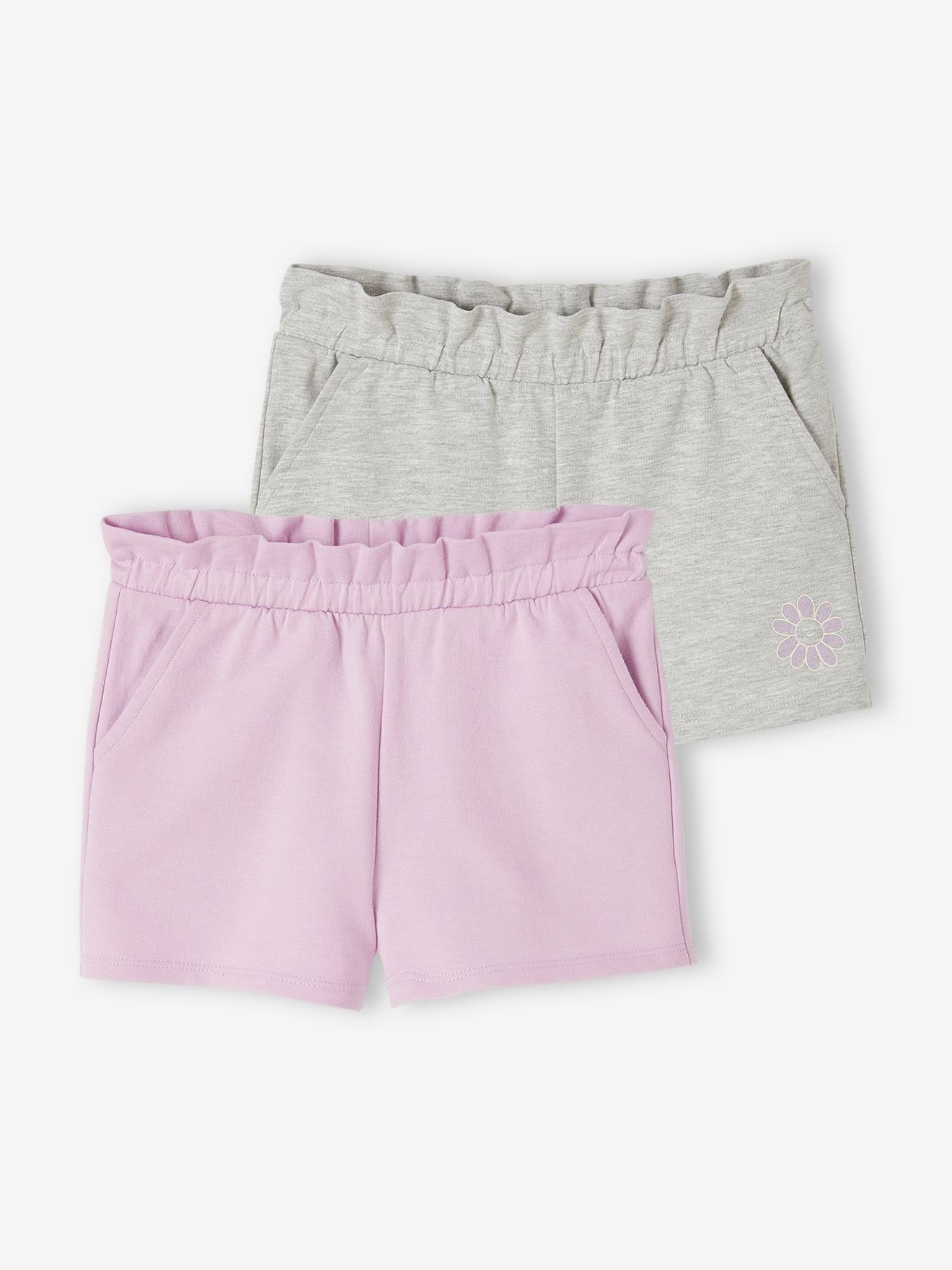 Wear them in the summer for a cool look or for sports! A pack of shorts so they can choose and play with different looks. 1 plain, easy to team with their favourite T-shirts, and one with trendy print. Pack of 2 pairs of shorts for girls Elasticated paperbag waistband Flower in marl grey 2 pockets on the front Loose fit cut Set of 2 pairs of shorts for girls, in jersey knit: 60% cotton, 40% pol