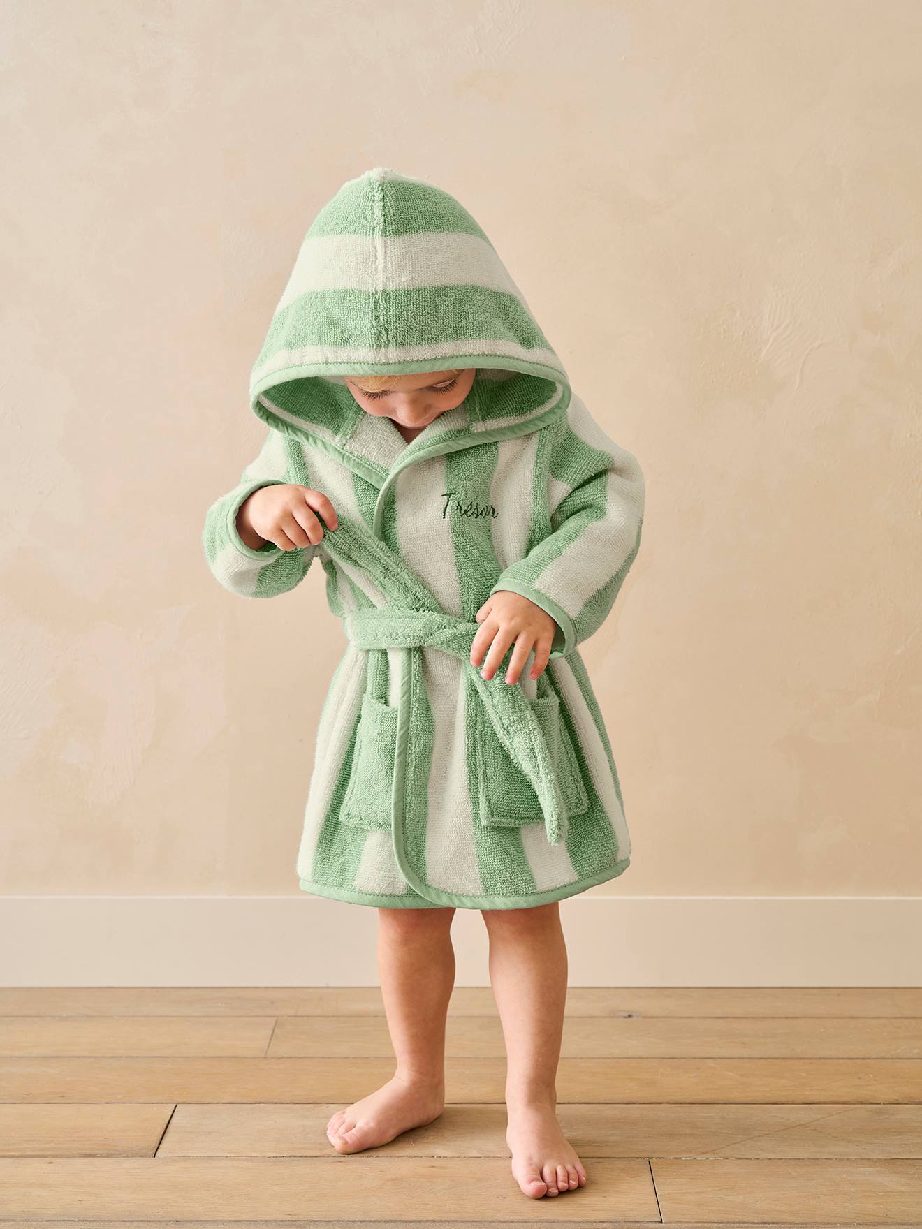 A striped dressing gown right on trend! Its soft, fluffy towelling fabric, made from 100% cotton 420 g/m2, ensures softness, comfort and excellent absorbency.A matchy-matchy dressing gown to wear for adorable cosy family moments at home, as it comes in baby, child and adult sizes. Show off the joy of being part of the same team... you'll love it! Jacquard stripes, yarn dyed Hood Elasticated and