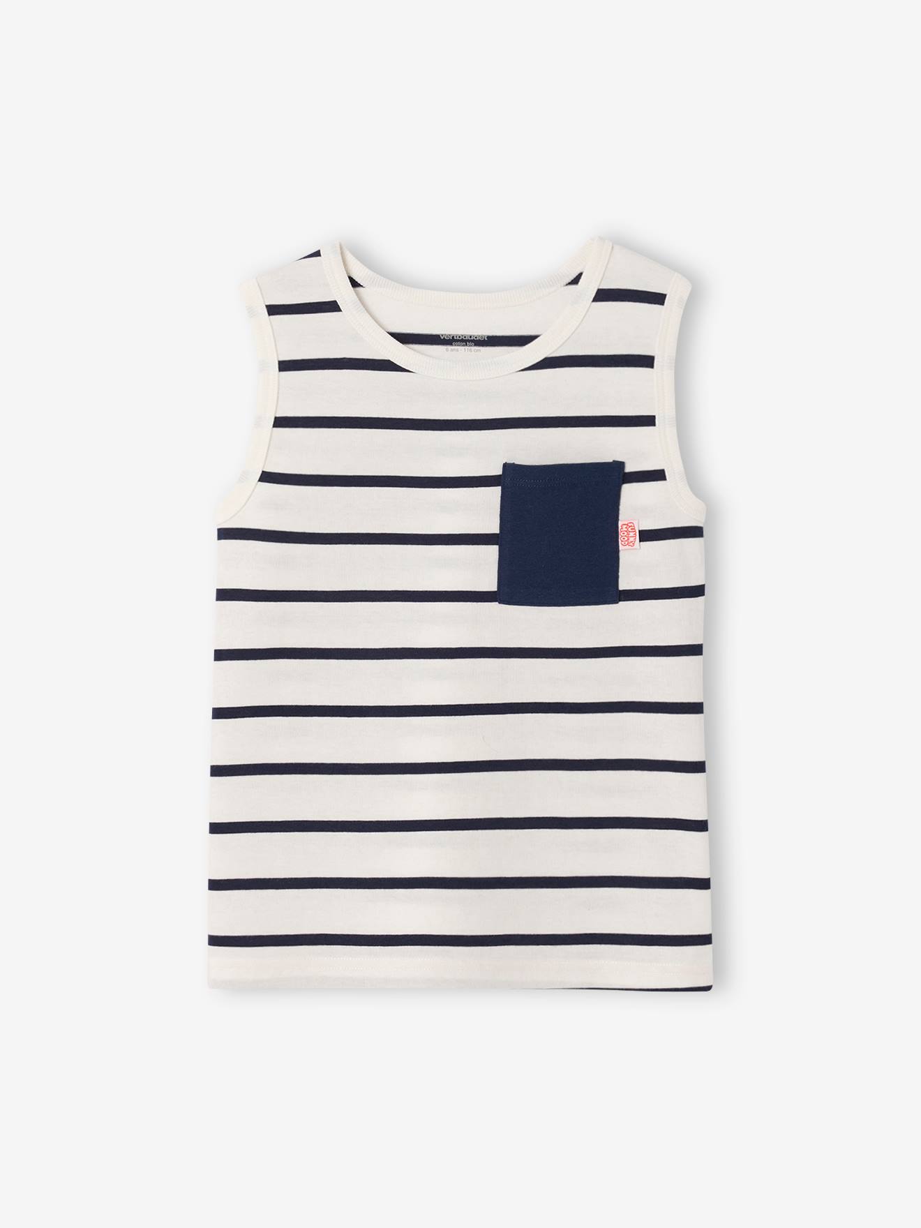 Here comes Summer! Let's go for stylish little looks with this striped tank top... A must-have in boys' wardrobes! We love the stripes in their fashionable colour for a cool summer! Tank top for boys Round neckline Woven stripes Breast pocket with "Funny Mood" tag Sleeveless top for boys: 80% cotton, 20% recycled cotton.